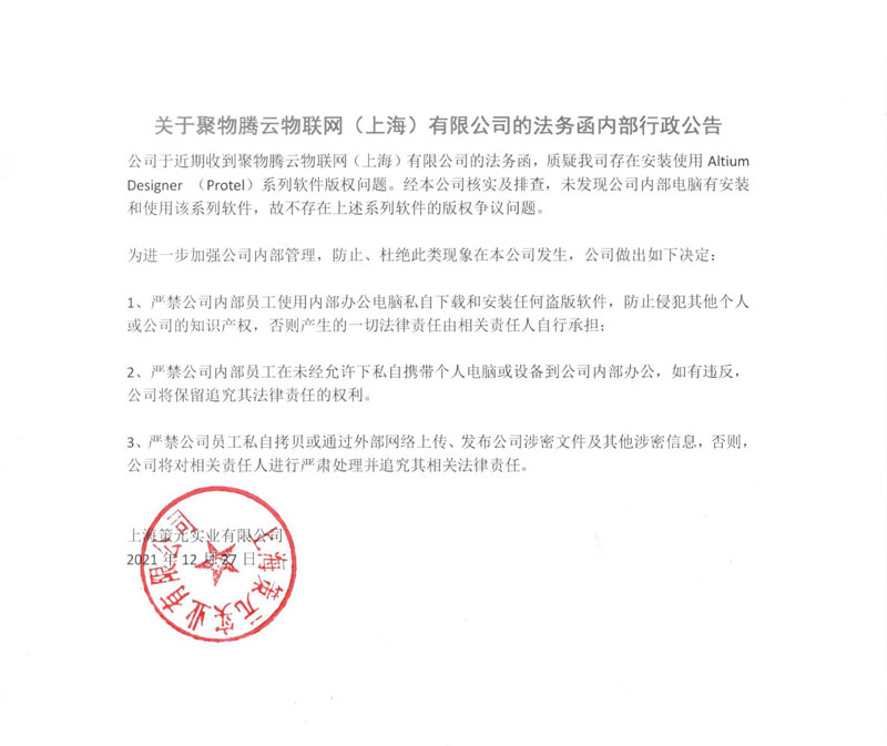 公司于近期收到聚物腾云物联网(上海)有限公司的法务涵,质疑我司存在安装使用Altium Designer(Protel)系列软件版权问题。经本公司核实及排查,未发现公司内部电脑有安装和使用该系列软件,故不存在上述系列软件的版权争议问题。